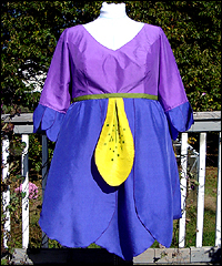 This dress was one of 6 that I created as bridesmaids' dresses for a fantasy wedding. Each bridesmaid represented a different flower. The bride designed the dresses, and I worked from her sketches. This skirt of this dress resembles an iris. It is made of custom-dyed dupioni silk, and has airbrushed details on the “petals”. There is a white silk skirt lining under the petal panels for modesty. |