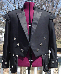 I made this jacket for a gentleman who was attending a wedding in a formal kilt. He wanted a cross between a Prince Charles jacket, and a piper doublet. He provided some sketches of his design, and I worked from there. This jacket is made of wool suiting, and has duchess satin accents. It is fully lined. The front panels are interlined with hair canvas, and padded as a suit jacket would be. |