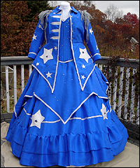 This bridal gown was created for a fantasy wedding. The bride designed her own dress, and I worked from her sketches to make it. I custom dyed all of the dupioni silk that this dress required, except for the accent fabric used for the pockets and jacket sash. It is comprised of 6 pieces- 2 long skirts with ruffles on the bottom (the inner most one is white), one star-shaped ¾ length skirt with silver trim, a white peasant-styled blouse, a steel-boned corset, and a tailed jacket. She wanted it in separate pieces so that she could mix-and-match them later for different events. The entire ensemble is decorated with various colors of Swarovski rhinestones and beads. The jacket has star-shaped pockets, epaulettes, and a large decorative bow in the back. The button holes on the jacket are surrounded by a appliques of comet tails, which are finished when the jacket is closed by the star-shaped buttons down the front. This dress required 55 yards of fabric! |