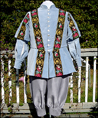 This outfit is the groom's ensemble for a fantasy wedding. The bride designed her husband's costume, and I used her sketches to create it. This outfit has three pieces- a pair of silk dupioni breeches, a silk Renaissance-styled shirt, and a fully-lined cotton velvet doublet with sleeves. The groom chose the trim on his outfit. I custom-dyed all of the fabrics required for this costume.