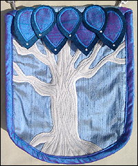 Fairy Tree Bag This bag is one of four, which I made to display in the art show at Lunacon 2009. I wanted my bags to be functional, yet still individual pieces of art. In other words, I wanted people to notice the picture first, and the bag second. This bag is another take on the “Summer Tree Bag”, but sewn with non-traditional colors to give it an ethereal feel. The dupioni silk background represents a rain shower, with which the light gray wool used for the tree trunk contrasts nicely. I stitched the wood grain of the trunk with blue thread to tie the color scheme together. The leaves of the tree are made of iridescent silk, which was appliquéd onto a deep aqua blue wool background. Each leaf is accented with a Swarovski crystal rhinestone. The side gusset is made of the same wool as the leaves, and finished with a scrolling wave design for visual interest. All of the bias tape was made by hand, and the bag fastens with a hidden rhinestone button located under the leaves. The bag is finished with a cotton lining, which matches the aqua wool nicely. |