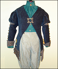 Fantasy Pageboy This costume was quite a challenge in design for me, since it was for a faerie-themed fantasy costume party, but the wearer didn’t want to dress as a faerie. We finally decided he should dress as a sort of upper-class servant character. The coat is made of dark blue upholstery fabric, with cuffs and appliqué work of a decorative tapestry fabric. The puffy shoulders have an inset panel of the tapestry fabric. It is lined with mustard yellow cotton. I couldn’t find frog clasps that I thought were appropriate for this costume, so I made the ones on the front of the coat from gold cording. The shirt is made from cotton broadcloth, and has a jabot, which buttons behind the neck. The breeches are made from a woven chenille upholstery fabric, and fasten in front with a square flap closure. |