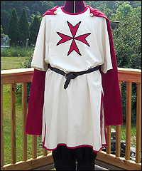 Knight of Malta This client sent me reference pictures of a statue that he liked, and asked me to recreate the statue’s costume for him with a few changes. The surcoat has ¾ length sleeves, side slits, and a detachable cloak. It is made of eggshell colored linen and lined with heavy weight crinkle cotton. It is trimmed in red cotton bias tape to match the Maltese cross appliqués on the front and back. The cloak is made of crinkle cotton and lined with cotton broadcloth. It has a white Maltese cross appliqué made of linen. The cloak buttons onto the surcoat at the shoulders. The pants are made of linen, and lace at the calves. I also made leather bracers to match this costume, which are also in this gallery. |