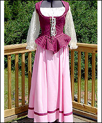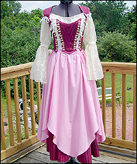 Renaissance Rose Girl This costume was created for a lady who sold roses at my local Renaissance faire. She requested the color scheme, and asked that I create an outfit within the acceptable rules for Faire working attire. The shirt is made of textured cotton, and has an elastic neckline so it can be worn at different levels of modesty. The underskirt is a cotton blend herringbone weave, and the overskirt is a textured cotton blend. I created the different tiers of the overskirt to represent the leaves on a rose. The bodice is made of a textured green denim, and finished with cotton bias tape. The tabs on the bodice serve two purposes- they help cover the gap between the skirt and the shirt that often occurs with period clothing, and they make the bodice more comfortable by preventing it from digging into the waist. The hat is made from the same herringbone fabric as the underskirt, and lined with satin. |