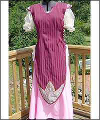 Sweet Amaryllis III This costume is one of three that I made for the renaissance faire band Sweet Amaryllis. The ladies in the band wanted coordinating costumes that reflected their own personal style. They chose the color scheme, and gave me an idea of the types of elements that they liked. This client didn’t want a bodice or corset, because she felt that constrictive clothing would inhibit her playing. Therefore, I made her a feminine tabard over a linen underskirt. The tabard has decorative appliqués on the front and back made of the same embroidered organza as the short puffy sleeves. It laces up the sides. The shoulders and the bottom of the tabard are finished with glass pearls. |