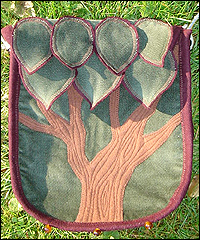 Summer Tree Bag I toyed with the idea of this bag in my mind for several months before creating it. I thought it would be interesting to separate the leaves of the tree from the branches by placing them on two separate layers. This approach gives the finished pouch a great deal of dimension. The leaves of the tree are attached to the closing flap of this pouch, so the entire piece creates a complete composition. The bag is made of uncut cotton corduroy, with a wool tree appliqué. The leaves of the tree are made of the same corduroy, but they are cut across the grain of the fabric for a difference in texture. I appliquéd the leaves to a burgundy wool before applying them for an extra splash of color, and to prevent them from fraying. The sides of the bag are made of the same brown wool as the tree trunk, and trimmed with burgundy wool to match the outer edges of the leaves. The lining is made of cotton twill for stability and durability. A button hidden under the tree leaves securely fastens it closed. I chose the colors for this bag to represent the richness of summer. |