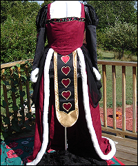 My good friend designed this “Queen of Hearts” dress, and commissioned me to make it for her. It is made of red jacquard with crepe backed satin sleeves, and faux fur trim along the hem and wrists. The transparent upper sleeves are made of organza, with opaque velvet ribbon stripes. The front skirt flap is gold and black satin. The attached overskirt is chiffon, and is gathered with elastic casings to form scallops. At the end of each scallop, there is a small stuffed heart made of red satin. All of the fur trim was applied by hand. This dress has an accompanying crown, which is also displayed in this gallery. |