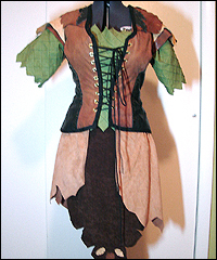 This costume was created for a customer who plays in a Live Action Role Playing game. Her character is an elf, and she requested the color scheme. The fully-lined bodice is made of leather with hand-painted gold details. The under dress and under skirt are suede cloth and cotton with leather leaf details. |