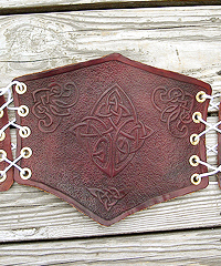 I made this cincher to use as a costume piece at my local Renaissance Faire. It is meant to be worn around the waist instead of a bodice or corset. It is hand-tooled with Celtic knot work designs and hand-dyed. |