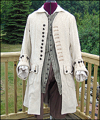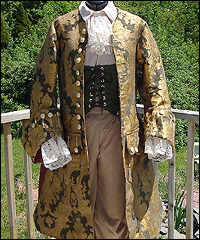 The customer who ordered this costume wanted a “governor-turned-pirate” sort of look. He wore this costume with a powdered wig and golden eye patch! The coat is made of woven jacquard with a dupioni silk liner in neutral beige. It has working pockets, decorated with buttoned flaps. The vest is heavy tapestry fabric, and I took great care to make both sides, as well as the back of it, symmetrical. The pants are made of ultra suede with silk lining, and the shirt is cotton. The removable jabot consists of six layers of hand-gathered lace, and buttons at the back of the neck. The wrists of the shirt are finished with lace to match the jabot, and button with the same buttons as the coat. |
