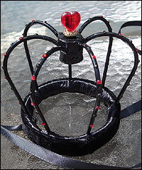 This crown is an accessory for the Queen of Hearts Dress that is also in this gallery. It is made of aluminum rods, which were shaped and welded together. The band is finished with satin ribbon and velvet. The crystals are Swarovski rhinestones, and the heart on the top is Czech glass. |