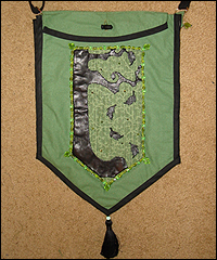 I made this bag as a gift for one of my favorite musicians, Heather Alexander. (Please check out her website in my links section!) It is made from raw silk with leather appliqué work and glass beads. The lining is cotton. All of the appliqués and beads were applied by hand, as were the Swarovski rhinestones in the background section of the center panel. I also made the leather button for the flap closure. |