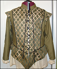 This pirate costume was for a lady who wanted a little bit of a feminine touch to a traditionally male style. I made the coat in a bold gold and green jacquard with a dupioni silk liner in contrasting rust color. The entire coat was cut out one piece at a time, in order to make it perfectly symmetrical. The back of the coat has a pleated flap for extra flare. The bodice is lightly boned for support, and is worn instead of a traditional male vest. The ultra suede pants have an elastic waist for comfort and ease of wear. The blouse is made of crinkle cotton, and has elastic channels in the sleeves that sit above the elbows for a puffy layered look. The removable jabot consists of 3 layers of hand-gathered lace, and buttons behind the neck. |