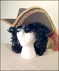 I have made a number of these hats, but these are the only ones I have pictures of. These two were created to match the gold and blue pirate costumes in this gallery. The green hat is made of wool felt, and trimmed with a wide woven trim to match the gold in the jacquard of the coat. The blue hat is made of the same jacquard as its matching coat. Both hats are lined with satin. |