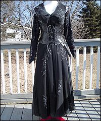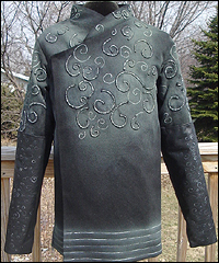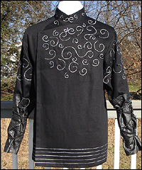 Deatheater Tunic This Deatheater tunic is a recreation from the movie “Harry Potter and the Order of the Phoenix”. My client requested only this one piece, and not the full costume. It is made of textured cotton twill, with a smooth cotton twill lining and removable leather lower sleeves. All of the swirled trim was hand painted, and hand-couched onto the garment. Extensive airbrushing with textile paint created the distressed effect on the fabric. The leather sleeves were hand-painted with silver textile paint, and are meant to be worn tied with cord to resemble fingerless gloves. The tunic closes with a series of heavy-duty snaps, which are invisible when the garment is worn. |
