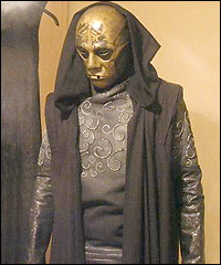 Bellatrix LeStrange (Silk Version) This Bellatrix costume is made of silk chiffon over a silk noil lining. It also has gathering at the bust line, which is a little more screen-accurate than the other dress in this gallery. All of the silver swirls are painted by hand, and the entire dress was airbrushed to give it a distressed appearance. The corset and wand holster are made of leather, which was hand-tooled and shaped over a plaster corset mold. The silk fabric flowed beautifully, and frayed more nicely than the polyester version.