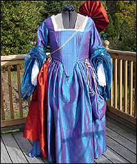 Elizabeth Dress This dress is a recreation of one of the dresses worn by Cate Blanchett in the movie Elizabeth. The dress is made from dupioni silk, with a paprika-colored taffeta underskirt (not shown) and organza oversleeves. The undersleeves are made from batiste. My client chose the fabrics and colors and requested that I make the bodice from silk instead of velvet, which the dress in the movie had. The bodice is fully boned in front and back, and partially boned on the sides. It laces up on the side-back seams for a unique look. The sheer partlet is detachable. The overskirt has a short train, and can be tied up into a bustle for dancing. The dupioni silk sash is hand stitched, and detachable. It snaps onto the back of the bodice, and then ties around the front of the dress with satin cords. When the sash is not worn, a small decorative silk flap fits into its place to cover the snaps. |