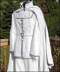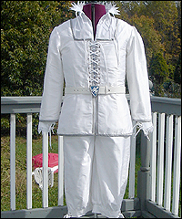 Herald Dress Whites 2 This costume is based on the one worn by Vanyel Ashkevron on the covers of Mercedes Lackey’s “Last Herald-Mage” series, which were painted by artist Jody Lee. This client requested this costume for her fiancé to wear at their wedding at a medieval faire. The shirt is made from cotton, with lace trim at the collar and cuffs. The breeches are made from dupioni silk, and lined in cotton twill for support. The jerkin is made from dupioni silk, interlined with needle-punched cotton, and lined in cotton. It is trimmed with hand-made silver silk bias tape. It laces up the front with silver grommets. The belt buckle was hand-sculpted, and then cast in resin and painted. The cloak is made of cotton twill, and lined in cotton. The entire edge of the cloak is trimmed with silk bias tape to match the jerkin. Since my client planned to have her wedding outside at a faire, I made her two seat cushions to protect her dress, and this white silk costume, from getting dirty. The seat cushions are made from upholstery jacquard, and interlined in 2 layers of needle-punched cotton. They easily roll or fold up for carrying in a bag, and have removable shoulder straps for carrying. |