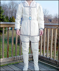Heralds of Valdemar- Dress Whites These costumes are based on the one worn by Vanyel Ashkevron on the covers of Mercedes Lackey’s “Last Herald-Mage” series, which were painted by artist Jody Lee. My best friend and I are huge fans of the books, and we just had to have these costumes! These versions of the costumes are what we refer to as our “dress whites”, and are fancier than the leather “field whites” listed below. The jerkins are made of silk, lined with cotton, and interlined with needle-punched cotton for warmth. The shirts are cotton, and the breeches are suedecloth. The collar and cuffs are decorated with a fancy lace trim. The belt buckles were hand-sculpted, and then cast in resin and painted. The cloaks are suedecloth lined with flannel, and interlined with heavy wool for warmth. I made all of the satin shantung bias tape trim by hand. We wear these costumes with white hose and calf-high boots. |