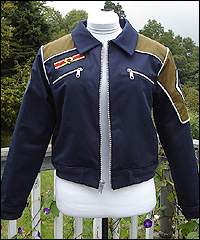 Preventer (Dark Blue Version) This coat is a recreation from the anime Gundam Wing Endless Waltz. In the anime, it is difficult to tell exactly what color the characters' uniforms are due to different lighting throughout the scenes. I have seen them interpreted as black, dark grey, and dark blue. This client requested the dark blue version, and also that I cut the length shorter than the other Preventer coats in my gallery. This coat is made of cotton twill with a cotton twill lining. All of the patches are hand made, using appliqué techniques. It has functional pockets on the sides and chest, and hand-made cording adorning all of the seams. There are adjustable straps on the sleeves. The waistband is made of cotton rib knit. |