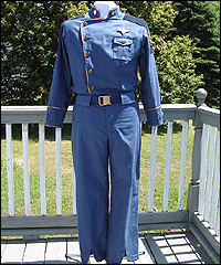 Battlestar Galactica This uniform is a recreation of the character Admiral Adama's costume in the TV show Battlestar Galactica. It is made of polished upholstery cotton, and lined in cotton broadcloth. The red cording is made of leather, which I custom painted. There is also a second row of metallic cording on top of the leather cording. The buttons on this costume were purchased from the same company that provided the buttons for the original TV costumes. The dark accents on the shoulders are made of suede. I custom painted the plastic buckles on the belt and the sleeves. |