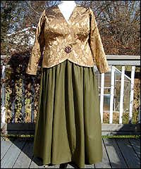 GoT-inspired Dress I made this costume for a client who admired one of the Oleena Tyrell costumes from Game of Thrones, but didn't want an exact duplicate. She really liked the shaping of the coat, so I used the same method as the original costume to shape the bodice with vertical panels instead of the traditional method of using darts. It's made of satin jacquard, and fully-lined. I added a large metallic flower accent on the front of the bodice as a homage to the original character's rose-shaped belt. The flowing skirt is made of silk noil, and has an elastic waistband. |