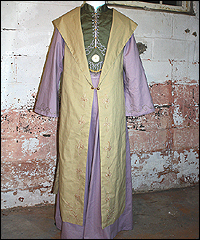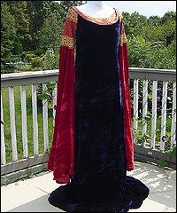 Arwen Undomiel This costume is a recreation of one of Arwen's dresses from the Lord of the Rings movies. It has two layers- a long sleeved under dress, and a sleeveless over dress. I custom dyed all of the fabrics for this costume, with the exception of the paisley brocade on the upper sleeves. The body of the dress and the huge half-circle sleeves are made of silk velvet, and the sleeves are lined in silk twill. The upper sleeves are made of brocade with a black and gold paisley motif. This paisley fabric was also used to create the thin band that borders the neckline of the outer dress. I custom tinted the wide gold trim, and also the gold cording that accents the sleeves, so that it would blend into the look of the overall costume. All of the wide gold trim had to be hand-applied, so that the stitches would remain invisible.