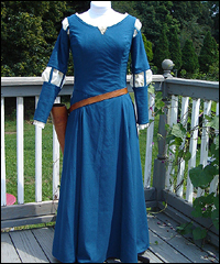 Brave This costume is Merida's dress from the movie “Brave”. It is made of silk noil, and the bodice is lined with heavy cotton for support. I custom-digitized the embroidered design on the pouch with Merida's family crest. The chemise under the dress is made of cotton broadcloth. The quiver is made of leather, and hand-tooled with Celtic knotwork. |