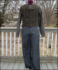 Wild West Ensemble I made this ensemble for a LARPer who was playing in a Wild West game in France. He wanted his costume modeled after a character in the TV show Deadwood. The cotton homespun trousers have pockets, a pocket watch pocket hidden in the waistband, and buttons for suspenders. The bib-front shirt is made of cotton homespun, and has small button cuffs at the wrists. The vest is made of wool, and has four welted pockets, which I carefully matched to the rest of the fabric design while inserting them. Finally, I made a cotton homespun bandana, so my client could hide his face if necessary while LARPing as a bandit. |