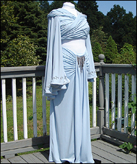 Padme Tatooine Dress This costume is from Start Wars Ep.2. My client wore it to Star Wars Celebration. It is made of polyester jersey crepe knit, which I custom-dyed to the correct color. I lined the shirt and the top of the skirt with cotton twill to add structure to the slinky fabric. All of the swirls were hand-stenciled with silver textile paint. I custom-made the silver cording, and hand-painted copper edges onto all of the glass beads that decorate the waistline and back of the hood. The pattern for this costume was quite tricky! |
