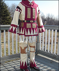 White Mage Final Fantasy XI I created this costume for a huge fan of the Final Fantasy video games, who planned to wear it to a concert featuring music from the series. It consists of a tunic, mantle, hat, decorative belt and belt pouch, mittens, boot spats, and custom painted shoes. My client and I discussed the elements of this costume at length, and designed this version based on his personal preferences. The tunic is made of wool, with leather on the underside of the sleeves. It features extensive applique work, and custom embroidery on the sleeves. The gold elements on the tunic are made of leather, which I airbrushed with a gold leather paint to give it a metallic shine. The mantle is made of wool, with custom embroidery on the hem, and hand-made gold silk cording on the hood edge. The boot spats are made of wool and leather, with gold metal decorative studs. The mittens are made of wool and leather, with gold silk cording separating the two fabrics. The hat is wool, with gold silk cording. The hat in the game features ear flaps and a small brim, but my client decided to change the design and leave those elements out on his costume. I made the belt from a strip of leather, which I custom-dyed and decorated with leather and metal accents. I custom painted shoes with leather paint as per my client's design. |
