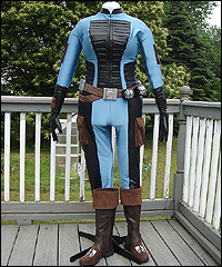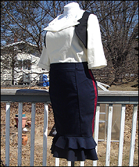 I made this costume for a Star Wars fan who wanted to dress as a female 1940's era Han Solo. She explained what pieces she wanted, and I created them using the same color scheme as Han's original outfit. The skirt is made of stretch suiting, with embroidered Corellian bloodstripes down the sides. The blouse is made of cotton twill, and has an interesting lapel. The sleeves fold up with button tabs. The bolero vest is made of self-lined cotton twill. |