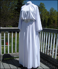 This is a reproduction of Princess Leia's classic costume from Star Wars. It's made of Jet Set knit, and is self lined. There is an elasticized waist channel under the belt, to help everything stay in place. The belt is made of leather, with aluminum accent plates, and metal buttons. It fastens with large snaps that are hidden under one of the plates. I also made removable hair buns to match her iconic hairstyle in the movie. They're made of synthetic hair, which I straightened before I attached it to molded buckrum base pieces. |