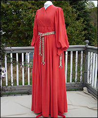 This dress is a reproduction of Princess Buttercup's from the movie The Princess Bride. It's made of silk noil, which I custom dyed. I cartridge pleated the sleeves by hand into the sleeve cuffs. The back laces up through threaded eyelets. I scoured the internet looking for clear reference for the belt, but to no avail. I could tell that it was beaded, and the overall shape of it, but that was about it. So, I did my best to achieve the proper “feel” of the belt, without knowing exactly what it looked like in the movie. The belt is made of silk trim from India, over a band of the silk noil that the dress is made from. I sewed glass pearls to the trim to add elegance. It attaches by way of large snaps underneath the front overlap.