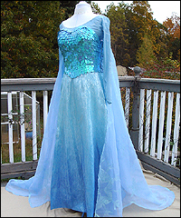 This dress is Elsa's from the movie Frozen. It's made of polyester fabric with silver metallic threads running through it. The bodice of the gown is heavily boned with spring steel boning. I hand-applied more than 1300 hand cut sequins to the bodice. I airbrushed the bottom hem of the gown to give it a gradient effect, and lined the skirt with a blue satin. The cape is made of polyester organza, which I custom dyed and custom stenciled with glitter textile paint. The sleeves are made from glittery sheer spandex which I custom dyed, and decorated with white glittery textile paint. |