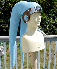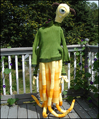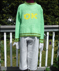 This was from a set of Monsters University costumes that I made for a family who wanted matching Halloween costumes. This is a child-sized costume. I made the sweater by altering an adult-sized sweater down to a child-sized one. I then custom dyed it, and silk-screened the symbol and the neck stripes onto the front and hems. I made the pants out of fleece, with matching fleece mittens. I custom dyed a child-sized baseball hat to complete the ensemble. |
