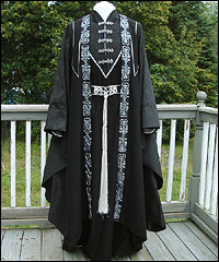 This costume was a challenge, as the original in the Lord of the Rings movies was very complicated and beautifully made. My client requested a black and silver version, instead of the white movie version. It consists of 4 pieces- trousers that are not seen, a double-sleeved under robe, a sleeveless over robe, and a decorative belt. The trousers were made from cotton twill. The body of the under robe was made from wool flannel, with a silk brocade yoke with attached collar. I custom-made the frog closures on the yoke from flat silver ribbon. The fitted under sleeves were made of a diamond-patterned chenille jacquard, which I hand decorated with hundreds of small silver studs. The wrists were finished with silk dupioni piping. The huge over sleeves were made of silk brocade, and were self-lined, so that the cuff could be turned back at the wrist. This under robe laced up the back with grommets. The over robe was made of wool flannel, and consisted of many pieces, which were defined by silk dupioni piping in the seams. The front trim was made of silk brocade, which I first stenciled with a silver textile paint, and then hand-applied silver satin cord to achieve the correct look. The belt was made of silk brocade, with silver embroidered appliques on the front, and silver cord for the front “lacing”. I unwound and braided the silver cord to mimic the original. The belt laced up the back with grommets. |