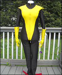 This costume is a reproduction of one of Kitty Pryde's from the X-Men comic books. It's made of moleskin spandex. I custom dyed the yellow parts of this costume. It was tricky to make the shoulder caps part of the front and back panels, and still have the sleeves underlap them. My client provided her own boots and belt for this costume.